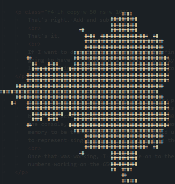 The first thing I decided I would need was a reference implementation in a language I was more familiar with. So I quickly whipped up a simple emulation of the console's pixelated framebuffer using '##' for set pixels and got to making it actually produce an image. This also involved finding a reasonable viewport offset and zoom level to produce a nice picture. The zoom level is - of course - 16 so that the coordinate scaling can be achieved by shifting the bits right by 4.