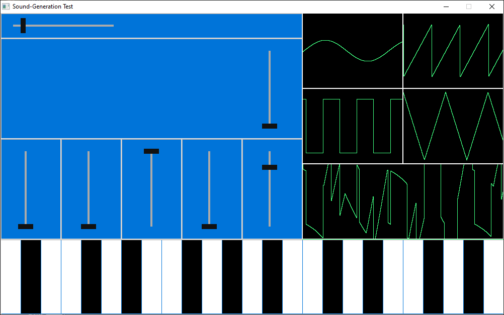 The first thing I tried was to generate some pure tones using various kinds of waveform. Pretty soon, I was able to create any kind of classic synth wave shape I wanted with quite simple functions. I was blasting square/pulse waves, triangle waves, sine waves and - my personal favourite - sawtooth waves at a, somewhat grating, 1khz. The next step was to extend this to actual note values and to add multiple channels. And - as usual - I went a bit overboard writing a relatively complete synthesis library with multiple channels, basic filter effects and volume envelopes. To test it out I threw together a very spartan test interface, with completely unlabelled faders for controlling the envelope parameters and per-channel volume.